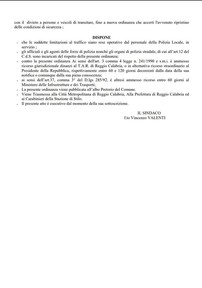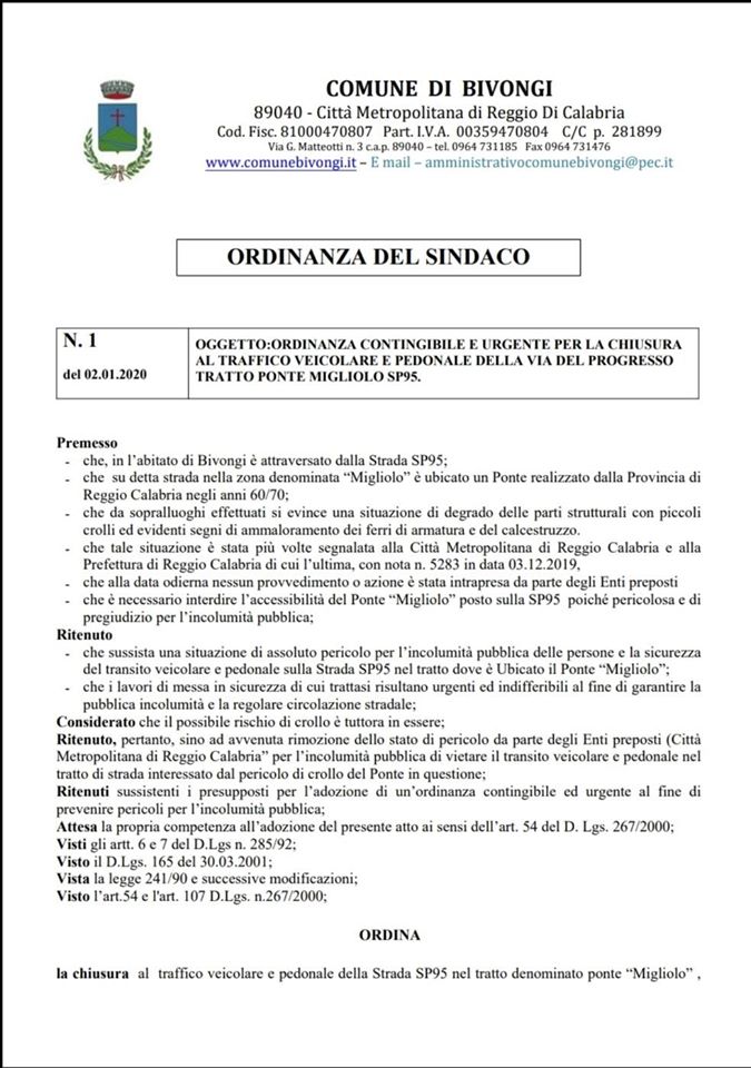 Il sindaco del Comune di Bivongi, con apposita ordinanza n. 1/2020 del 2 gennaio 2020, ha disposto la chiusura al transito sul ponte posto lungo la Strada Provinciale n. 95 in zona “Migliolo” del centro abitato per motivi di sicurezza.