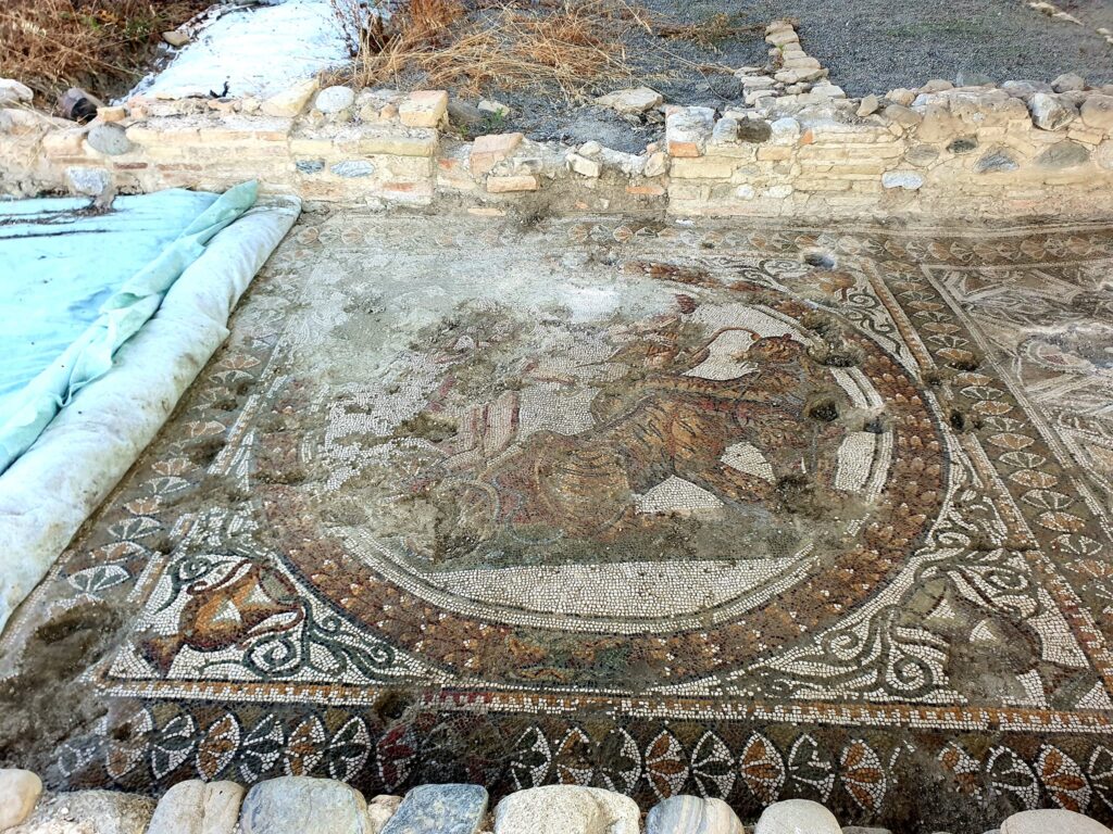 Tra le scene rappresentata nei mosaici le tessere banche, versi, blu, gialle e rosse riprendono il Dio Dionisio assieme a fantastiche tigri in un sapiente equilibrio di colori, sfumature e luci dettate dall’artigianalità di singole tessere affiancate le une alle altre per creare una meravigli artistica capace di resistere nel tempo e nella storia, raccontando ai posteri la cultura materiale dell’epoca romana e gli antichi impieghi della domus romana.