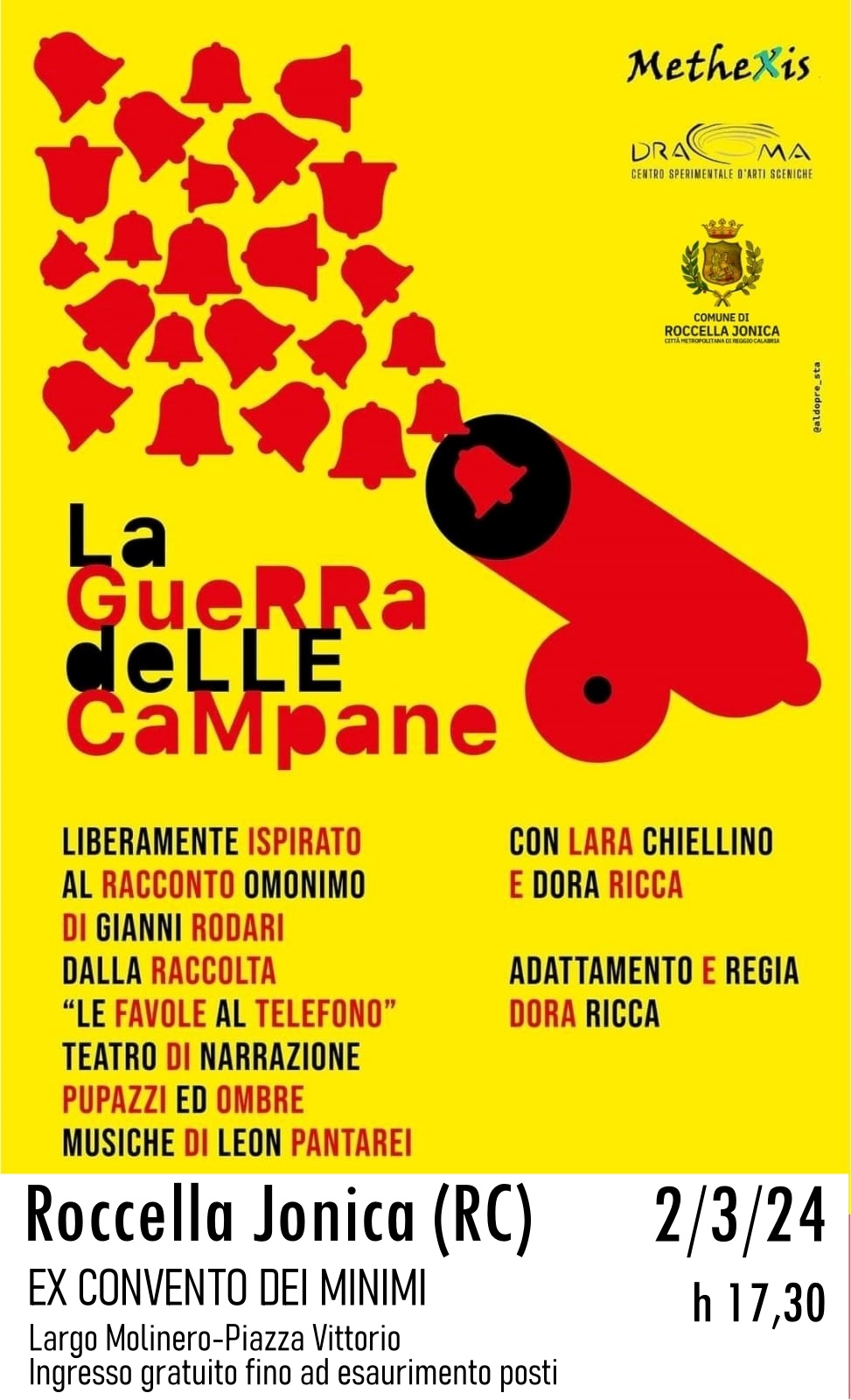 Sabato 2 marzo, alle ore 17.30, all’ex Convento dei Minimi di Roccella Jonica, sarà rappresentato lo spettacolo teatrale “La guerra delle campane” con la regia di Dora Ricca, le musiche originali di Leon Vulpitta Panta Rei e con protagoniste la stessa regista insieme all’attrice Lara Chiellino.