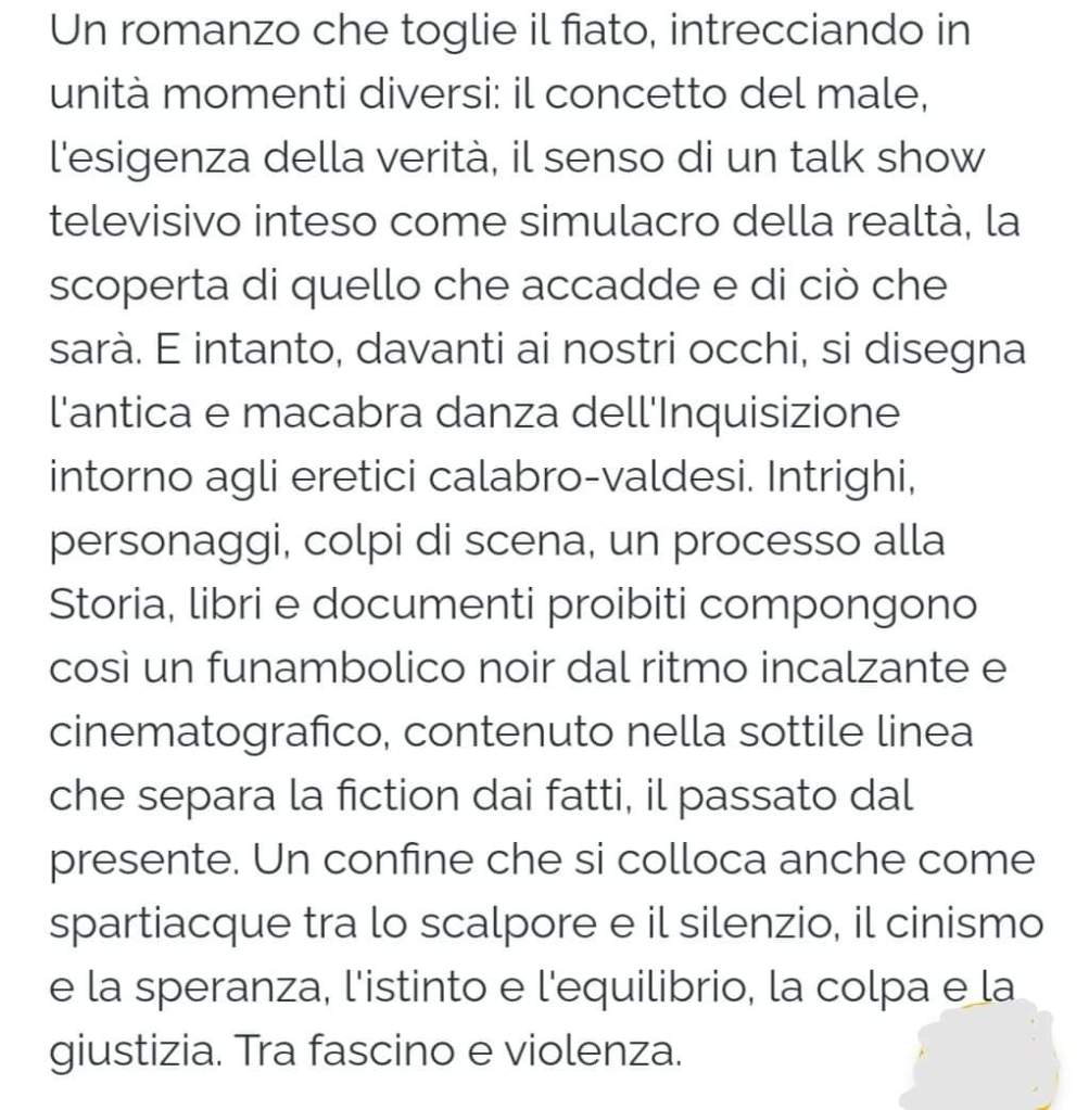La magia della letteratura, e quindi anche questo libro, lo permette. Una storia di ordinaria eresia, dunque, di ordinaria persecuzione religiosa, politica e sociale, un romanzo che contiene tante storie di ordinaria e santa Inquisizione, di miserie umane che la Storia fa passare per ragioni di stato, di assenza di pietas(nel senso romano di rispetto per l’uomo). Tutto confluisce nel filo narrativo che trasporta queste storie in un talk show televisivo nella splendida location del Museo del cinema di Torino, durante il quale si processa la Storia, ristabilendone la realtà appunto storica.