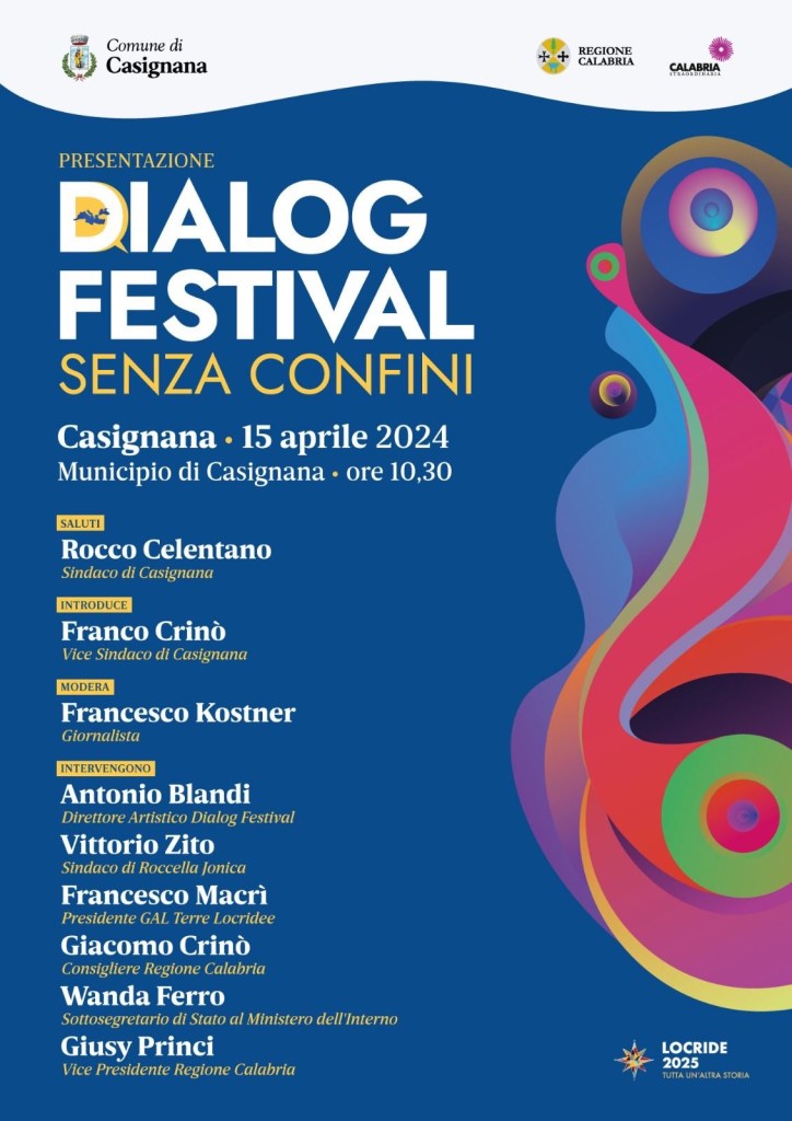 Lunedì 15 aprile 2024 alle ore 10,30 presso la Sala Consiliare del Municipio di Casignana (RC) si terrà la presentazione di DialogFestival (Tema dell’edizione 2024: “Senza Confini”), che si svolgerà a Casignana (RC) a partire dal mese di luglio 2024.