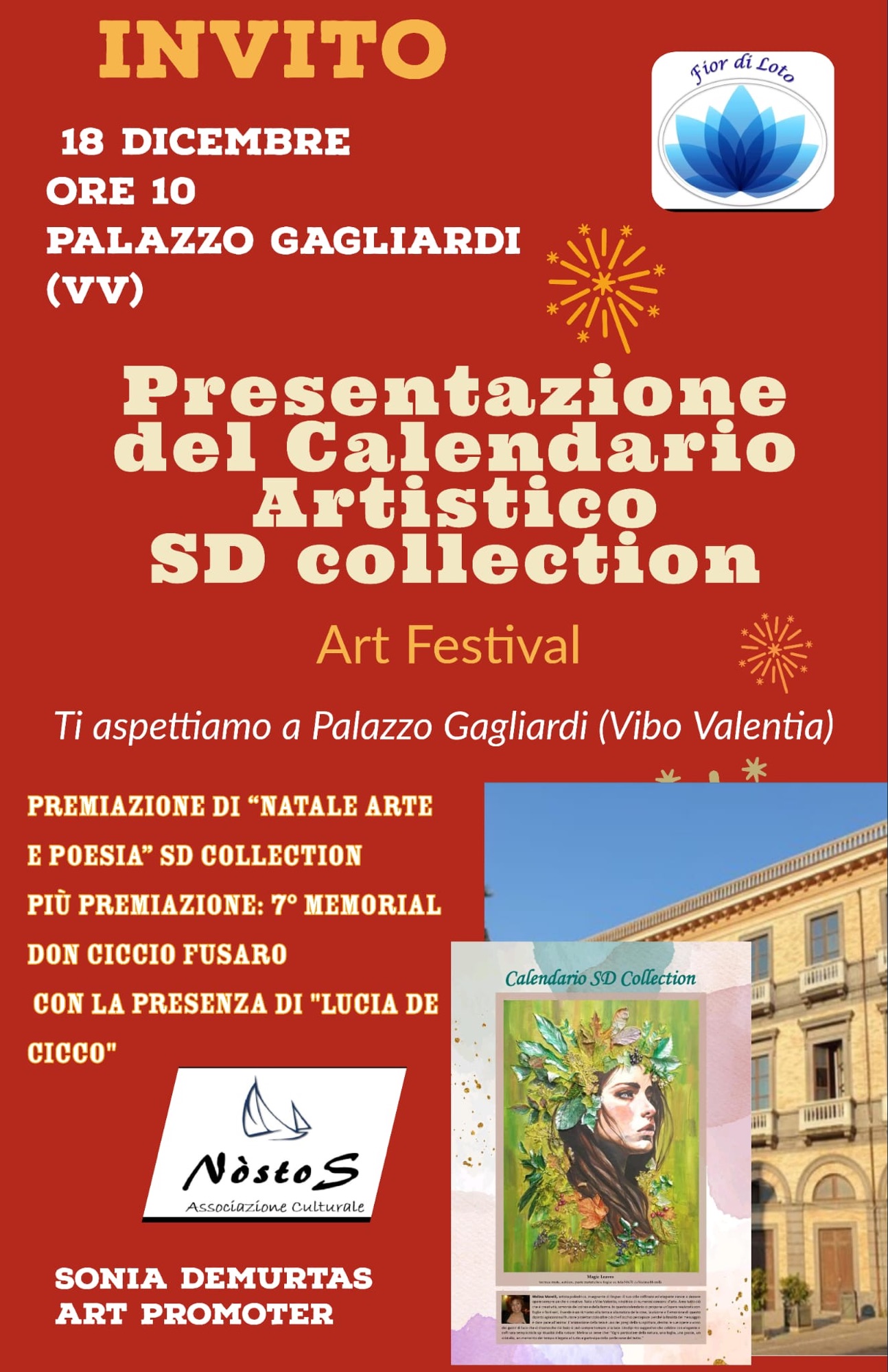 L’Associazione Nostos, con il direttore artistico Matteo Pio Manna e la presidente Lucia De Cicco, celebra il talento e la creatività calabrese con il prestigioso Settimo Memorial Don Ciccio Fusaro. L’evento si terrà il 18 dicembre 2024, presso la splendida cornice di Palazzo Gagliardi a Vibo Valentia, in occasione della presentazione del Calendario artistico-poetico di SD Edizioni e del concorso “Natale Arte e Poesia”.
