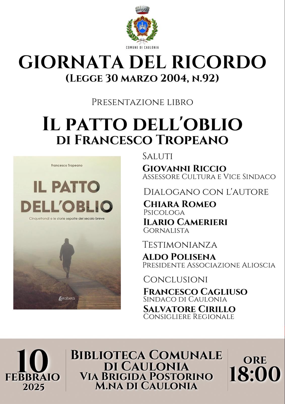 Caulonia si unisce al dovere della memoria con un’iniziativa di grande valore storico e culturale. In occasione del Giorno del Ricordo, il Comune ha organizzato la presentazione del libro Il Patto dell’Oblio di Francesco Tropeano, un’opera che getta nuova luce sulle vicende della Resistenza meridionale e sulla complessa eredità della Seconda guerra mondiale.