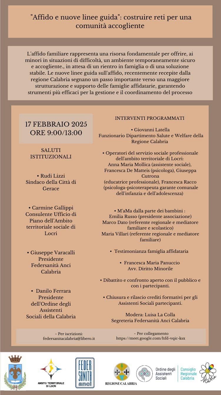 GERACE (RC) – Il prossimo 17 febbraio 2025, dalle ore 9:00 alle 13:00, la città di Gerace ospiterà un evento dedicato alle nuove linee guida per l’affido familiare adottate in Calabria. Un tema di grande rilievo sociale, che pone al centro l’importanza di offrire ai minori in difficoltà un ambiente sicuro e accogliente, grazie alla collaborazione di famiglie affidatarie, istituzioni e operatori del settore.