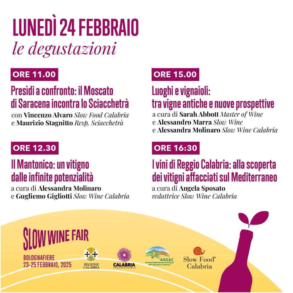 Il programma della fiera prevede numerosi appuntamenti dedicati alla scoperta dei vini calabresi. Durante le degustazioni guidate, esperti e appassionati potranno approfondire alcune delle varietà più rappresentative della regione. Tra queste, il Moscato di Saracena, storico passito del Pollino che verrà messo a confronto con lo Sciacchetrà ligure, e il Mantonico, un vitigno dalle grandi potenzialità ancora poco conosciuto al di fuori dei confini regionali. Si parlerà anche del Magliocco, con le sue diverse interpretazioni, e del Nerello e del Calabrese, due delle varietà più iconiche della viticoltura calabrese.