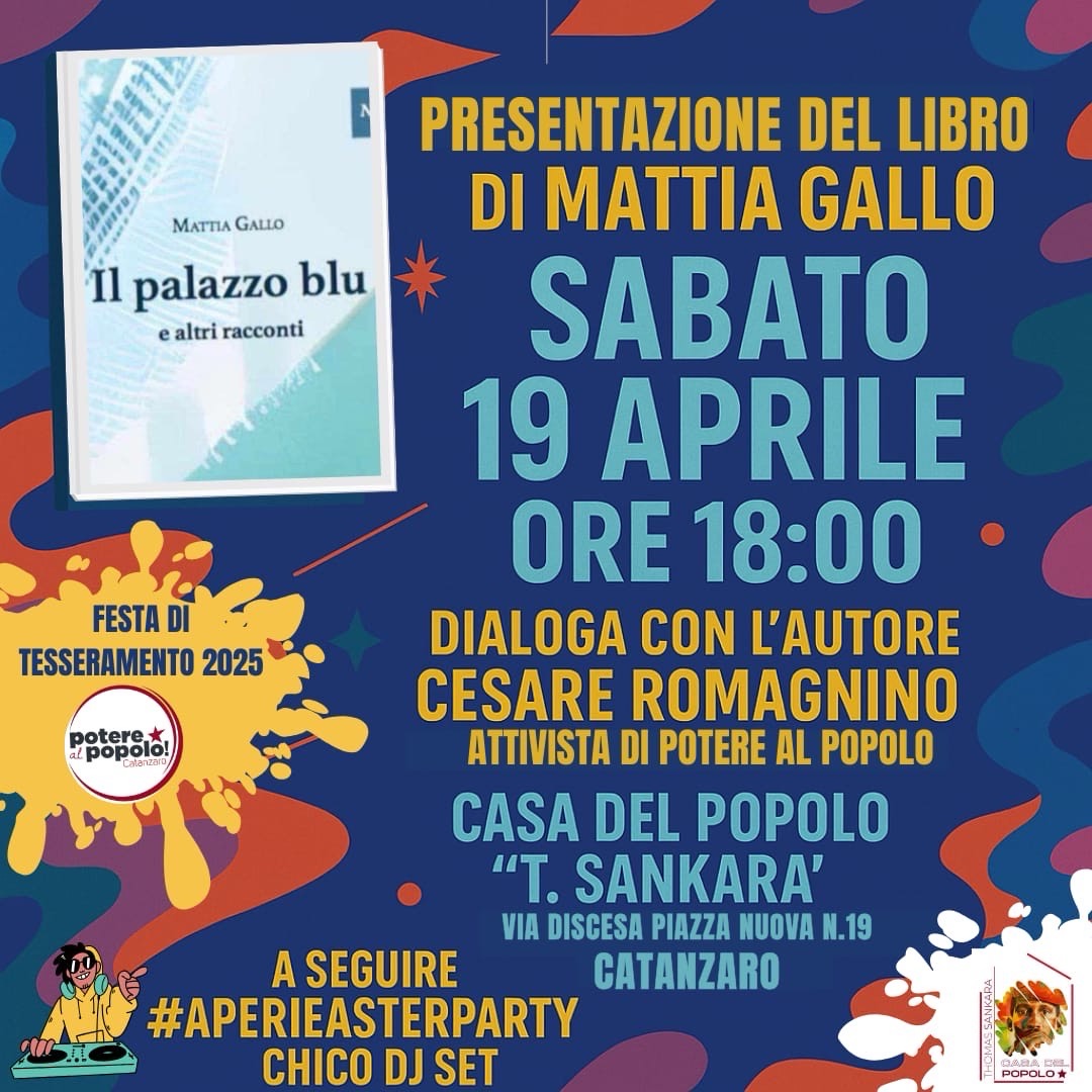 Sabato 19 aprile, alle ore 18, in Via Discesa Piazza Nuova, si terrà la presentazione del libro “Il palazzo blu e altri racconti” di Mattia Gallo, attivista e docente alla Casa del Popolo Thomas Sankara di Catanzaro.