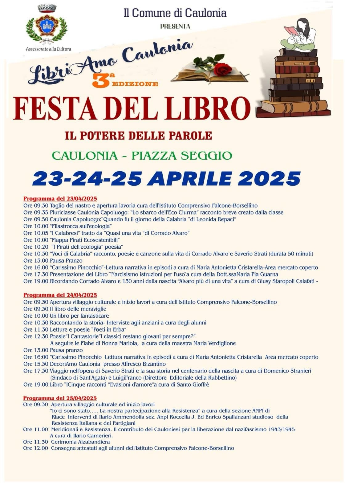 Il Comune di Caulonia, con il patrocinio dell’Assessorato alla Cultura, presenta la terza edizione della Festa del Libro – LibriAmo Caulonia, che si terrà dal 23 al 25 aprile 2025 nella suggestiva cornice di Piazza Seggio. Il tema di quest’anno, “Il potere delle parole”, sarà il filo conduttore di tre giornate dedicate alla letteratura, alla memoria, alla creatività e al coinvolgimento delle scuole e della comunità.