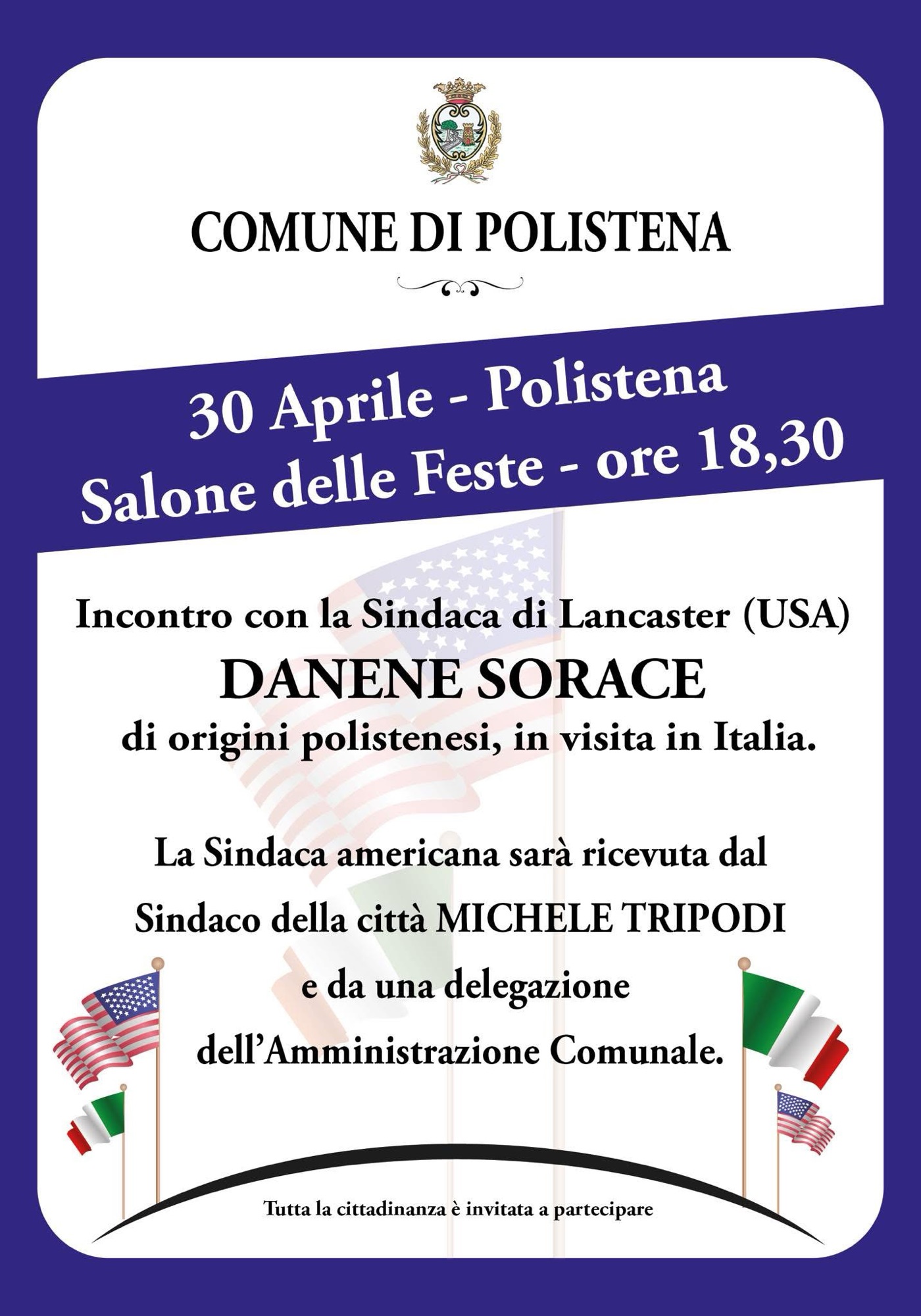 POLISTENA – Una visita speciale quella in programma per mercoledì 30 aprile a Polistena. La città si prepara infatti ad accogliere Danene Sorace, sindaca di Lancaster, cittadina della Pennsylvania (USA), che vanta origini polistenesi.