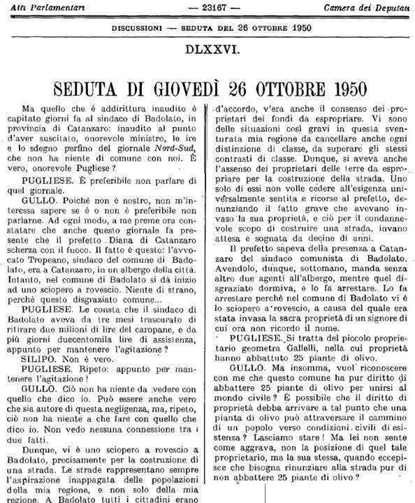 E la strada di Soglia?! Trentamila (circa) giornate lavorative (mai pagate) per dei vantaggi minimi e riservati a pochi piccoli proprietari, con scarsissima o nulla incidenza sull’economia locale?! Giuseppe Samà, che abbiamo ascoltato a lungo, sostiene che lo sciopero a rovescio del 1950 ha comunque dato buoni risultati. Ci dice, Giuseppe Samà, che nell’immediato sono stati aperti in Badolato numerosi cantieri di lavoro per alleviare la piaga della disoccupazione. Ed è stato emanato un decreto che obbligava i proprietari terrieri ad assumere braccianti agricoli in numero rapportato all’ettarocoltura.