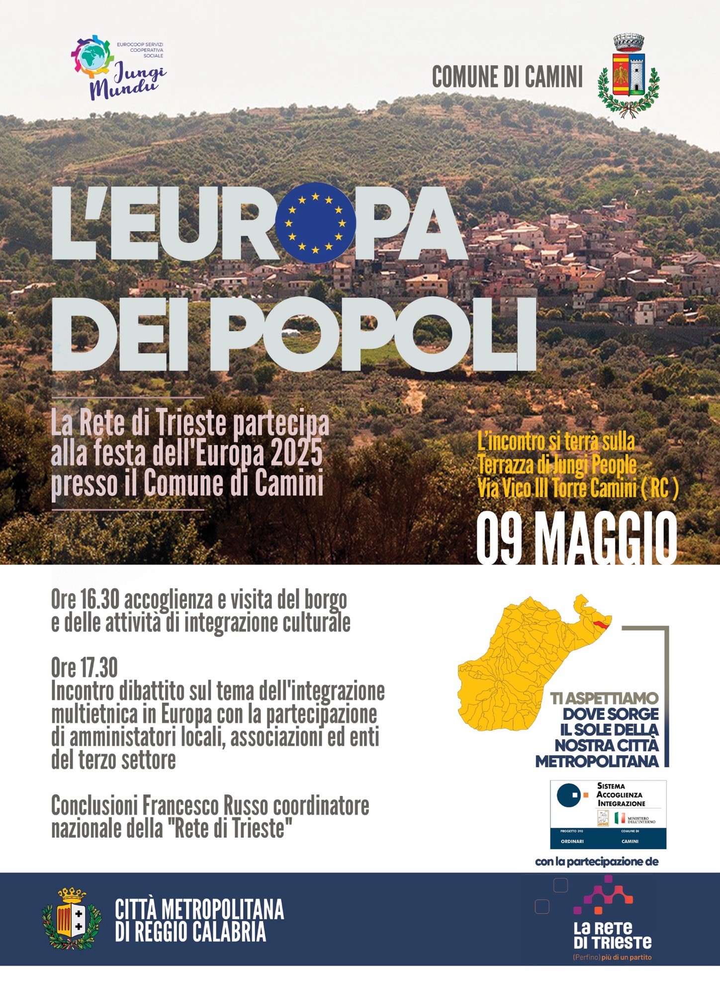 “L’Europa dei popoli” è un’iniziativa promossa dal Comune di Camini e dalla Rete di Trieste che si articolerà in due momenti. Nel pomeriggio sarà promossa una visita al borgo e alle attività di integrazione culturale messe in campo; subito a seguire, si darà vita ad un dibattito dedicato al tema dell’integrazione multietnica in Europa. Parteciperanno alla giornata decine di amministratori locali provenienti da tutta la Calabria e associazioni ed enti di Terzo Settore.