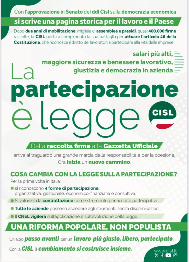 Per la prima volta in Italia, una legge di iniziativa popolare dà attuazione a un principio costituzionale, riconoscendo e incentivando, attraverso la contrattazione, la partecipazione attiva dei lavoratori alla vita delle imprese, come previsto dall’articolo 46 della nostra Carta fondamentale. Un traguardo che resterà nella storia del mondo del lavoro italiano. Ma soprattutto è l’inizio di una nuova fase per le relazioni industriali del nostro Paese.