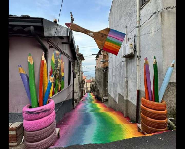 Tra le attrazioni più affascinanti, una scalinata dipinta nei colori dell’arcobaleno sembra portare dritta in un’altra dimensione: è uno dei luoghi più fotografati e amati dai visitatori, simbolo della rinascita creativa del borgo.