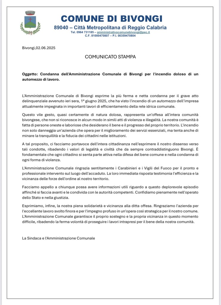 L’Amministrazione Comunale di Bivongi esprime la più ferma e netta condanna per il grave atto delinquenziale avvenuto ieri sera, 1° giugno 2025, che ha visto l’incendio di un automezzo dell’impresa attualmente impegnata in importanti lavori di efficientamento della rete idrica comunale.