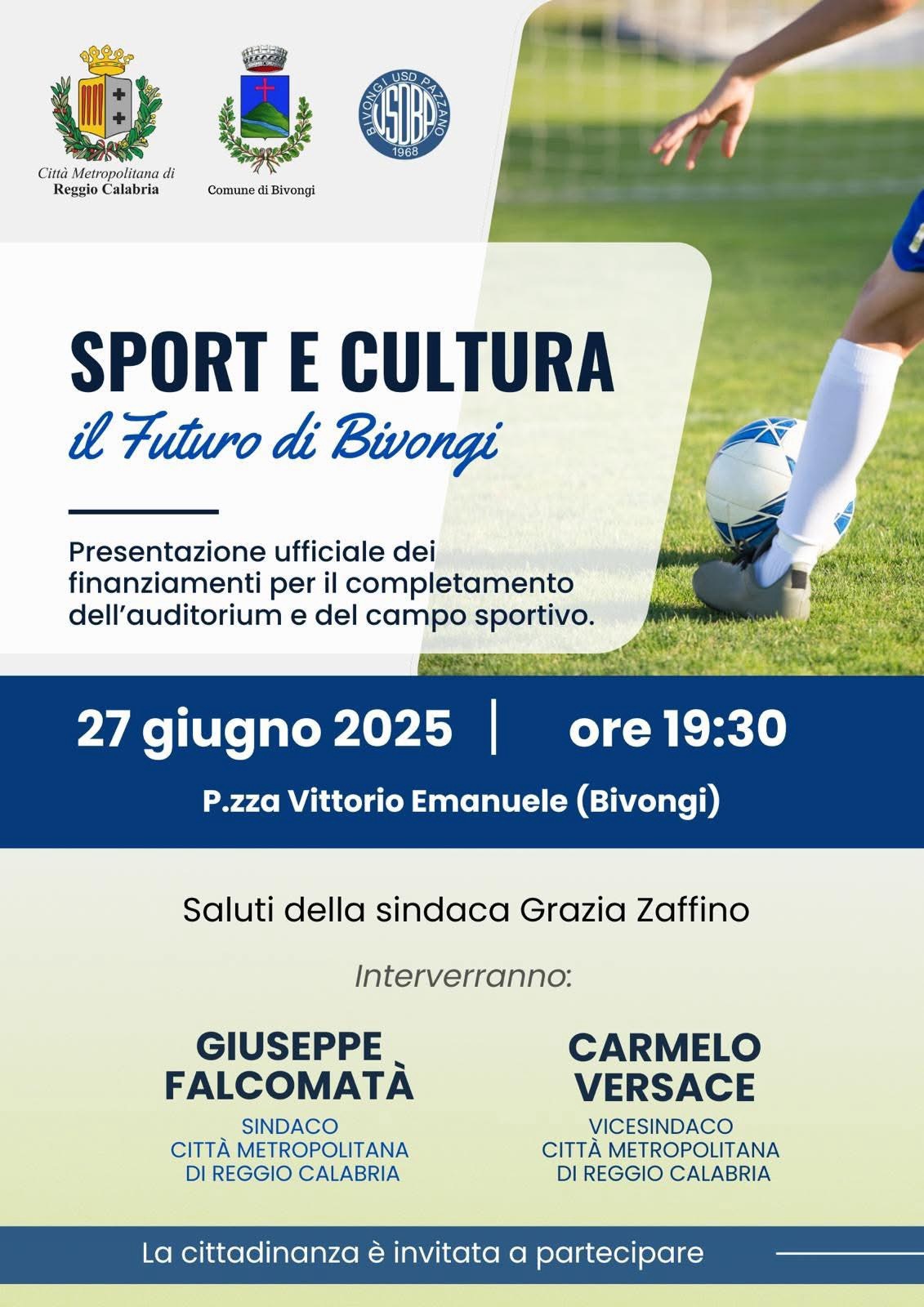 Bivongi, 25/06/2025 โ L’Amministrazione Comunale di Bivongi รจ lieta di annunciare l’approvazione di due significativi finanziamenti da parte della Cittร Metropolitana di Reggio Calabria, destinati al completamento dell’Auditorium comunale e al rifacimento del Campo Sportivo. Questi importanti investimenti rappresentano un passo fondamentale per la crescita e lo sviluppo della nostra comunitร .