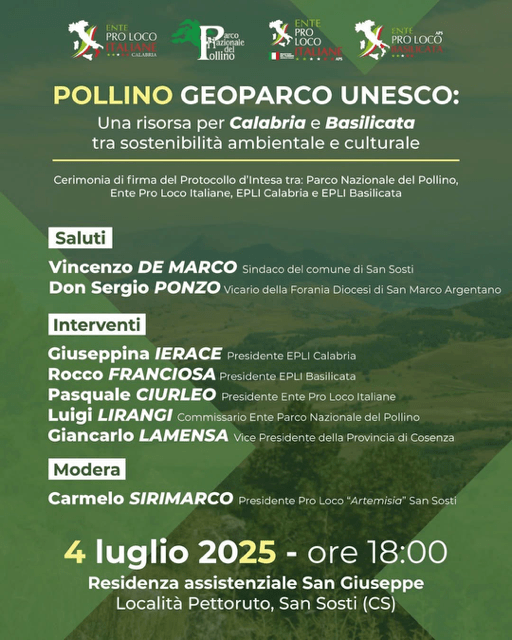 San Sosti, 28 giugno 2025- “Pollino Geoparco Unesco: una risorsa per Calabria e Basilicata tra sostenibilità ambientale e culturale” è il tema dell’incontro promosso dalla Rete Associativa di Terzo Settore Ente Pro Loco Italiane e l’Ente Parco Nazionale del Pollino con la collaborazione della Pro Loco “Artemisia” San Sosti e i comitati regionali Ente Pro Loco Basilicata Aps e Ente Pro Loco Calabria Aps in programma il prossimo venerdì 4 luglio 2025 alle ore 18 presso la residenza assistenziale San Giuseppe in località Pettoruto di San Sosti (Cs). All’incontro moderato da Carmelo Sirimarco Presidente Pro Loco “Artemisia” San Sosti dopo i saluti del Sindaco di San Sosti Vincenzo De Marco e di Don Sergio Ponzo Vicario della Forania Diocesi di San Marco Argentano prenderanno parte Giuseppina Ierace Presidente Ente Pro Loco Calabira, Rocco Franciosa Presidente Ente Pro Loco Basilicata, Pasquale Ciurleo Presidente nazionale Ente Pro Loco Italiane Aps, Giancarlo Lamensa Vicepresidente della Provincia di Cosenza e Luigi Lirangi Commissario Ente Parco Nazionale del Pollino. Per l’occasione si svolgerà la cerimonia di firma del Protocollo d’intesa tra: Ente Parco Nazionale del Pollino, Ente Pro Loco Italiane, Ente Pro Loco Calabria ed Ente Pro Loco Basilicata per la promozione della sostenibilità ambientale e la valorizzazione culturale, enogastronomica e turistica del territorio del Parco del Pollino Geoparco Unesco.