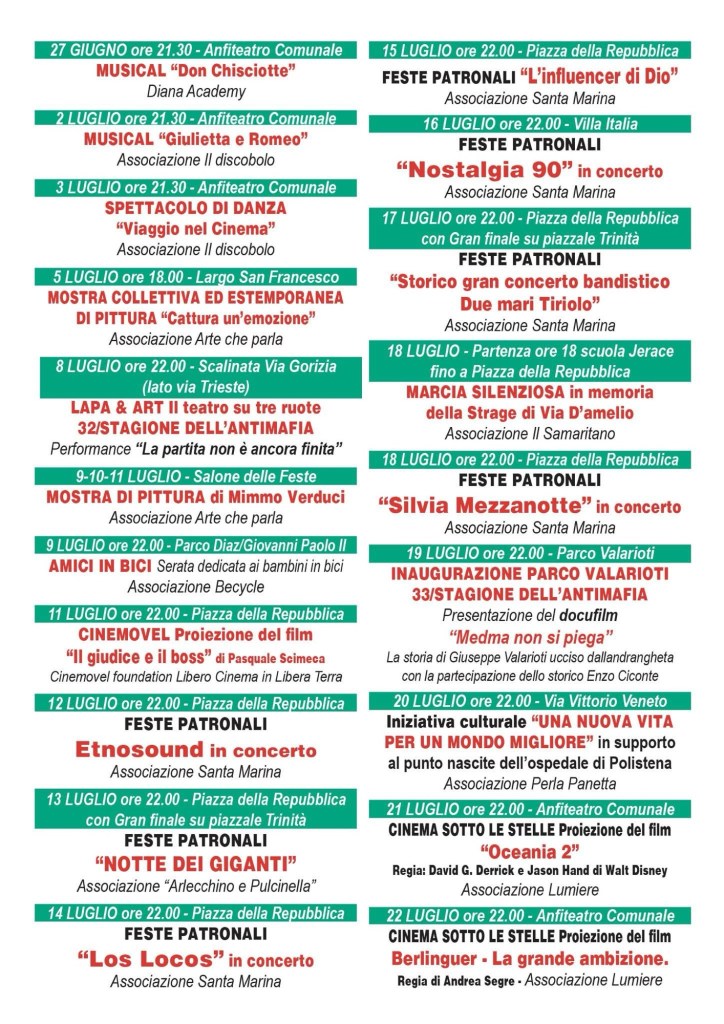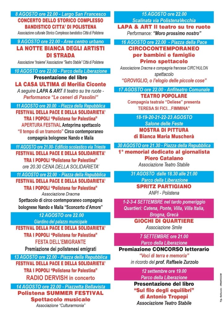 La tradizionale Giornata dedicata all’Emigrante si svolgerà nel giardino del palazzo municipale e sarà allietata dalle sinfonie dello Storico Complesso Bandistico Città di Polistena. La giornata sarà inclusa nel Festival della pace e della Solidarietà tra i popoli che per l’occasione si focalizzerà sul genocidio in atto a Gaza e vedrà esibirsi il gruppo Radio Dervish con il cantante palestinese Nabil Salameh.