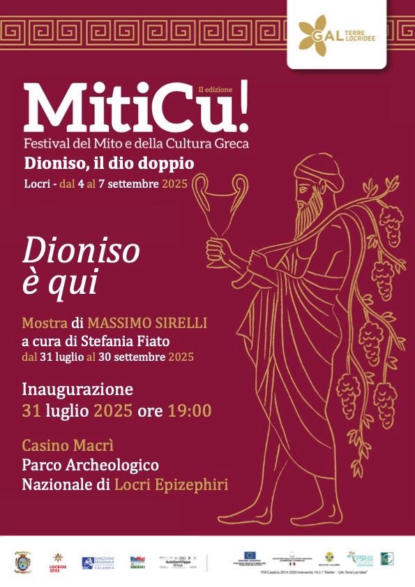 E sempre nell’ambito di MitiCu, nel linguaggio dell’arte contemporanea, il 31 luglio, alle ore 19.00, nelle sale del Casino Macrì nel Parco Archeologico nazionale di Locri Epizefiri, sarà inaugurata la mostra “Dioniso è qui” di Massimo Sirelli, curata da Stefania Fiato e visitabile fino al 30 settembre.