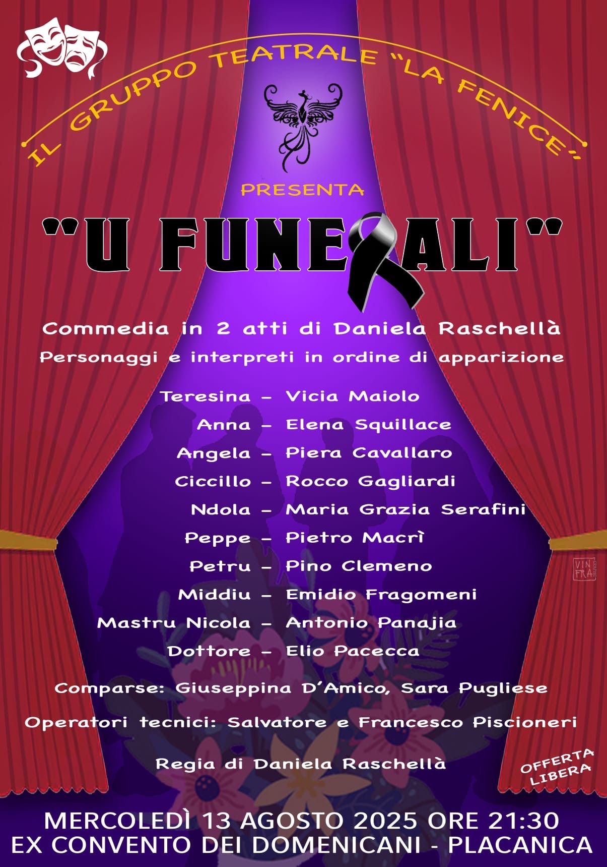 “U Funerali” è una commedia che gioca sui paradossi della vita quotidiana e sugli imprevisti che ruotano attorno a un evento solitamente triste come un funerale, capovolgendolo in chiave ironica e surreale. Attraverso personaggi vivaci e dialoghi brillanti, la pièce mette in luce dinamiche familiari e sociali che faranno sorridere e riflettere lo spettatore.