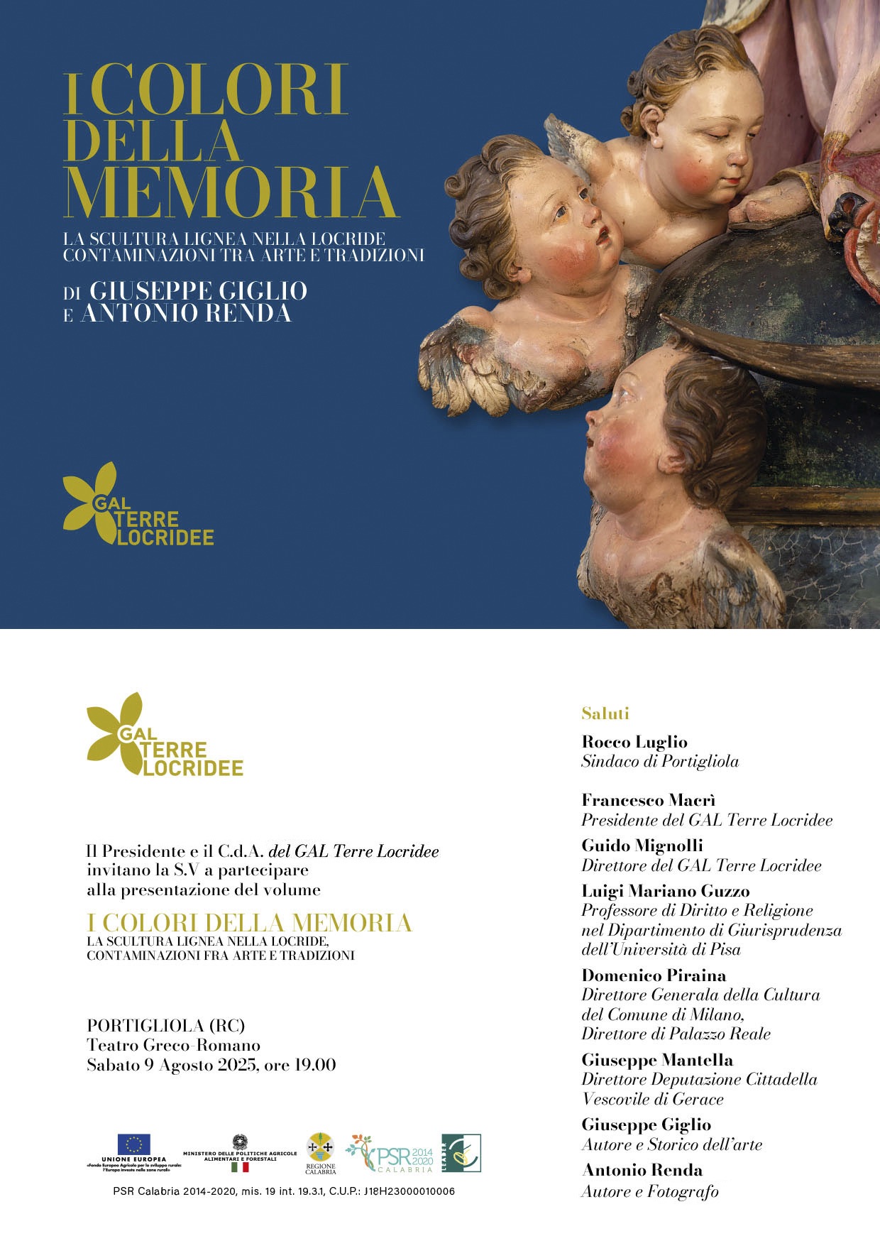 Sarà presentato sabato 9 agosto 2025, alle ore 19.00, nel suggestivo scenario del Teatro Greco-Romano di Portigliola, il libro “I colori della memoria” di Giuseppe Giglio e Antonio Renda, frutto di un percorso progettuale finanziato dal Gal Terre Locridee (con PSR Calabria 2014-2020, mis. 19 int. 19.3.1) nell’ambito della strategia di valorizzazione del territorio attraverso l’emersione del patrimonio culturale. Ricerca storica e documentazione fotografica hanno dato vita a un volume che ricostruisce l’evoluzione artistica della Locride dal Seicento ai primi del Novecento attraverso il ricco patrimonio conservato nei luoghi di culto, costituito in gran parte da bellissime statue lignee.