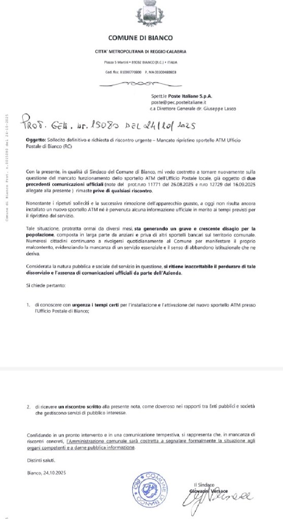 Il sindaco di Bianco, Giovanni Versace, ha scritto più volte alla Direzione generale di Poste Italiane, l’ultima lettera solo pochi giorni fa, chiedendo un intervento urgente.
