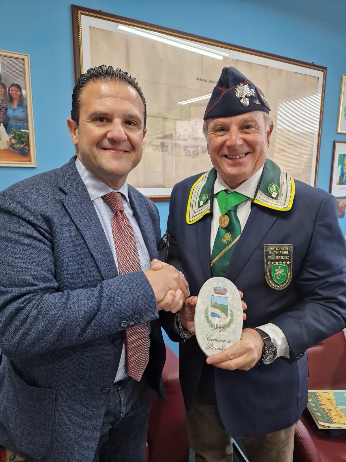 A conclusione dell’incontro, il Presidente Cap. Cosimo Sframeli,ha consegnato il calendario storico mauriziano 2026 al SindacoAvv. Vincenzo Maesano, sottolineando che “l’impegno e la dedizione dei cittadini e delle istituzioni locali, in una terra considerata tra le più depresse d’Italia, rappresentano una coraggiosa scelta di servizio e di solidarietà per la crescita del bene comune, contro la ‘ndrangheta e ogni espressione di criminalità”. Il Sindaco ha ringraziato ed elogiato l’Associazione del Nastro Verde, ribadendo: “Sono fondamentali gli esempi e i riferimenti di ogni giorno perché ci sia benessere e crescita delPaese. E il Nastro Verde nazionale e regionale rappresenta un modello che richiama ai valori prerogative delle Forze Armate,testimoniando e contribuendo alla costruzione di un Paese fondato sulla dignità del lavoro, sulla giustizia e sulla pace”. Il primo cittadino ha, quindi, donato il crest del Comune di Bovalino inciso sulla pregiata “pietra” di Lazzaro, una frazione del Comune di Montebello Jionico (RC), al Nastro Verde Calabria.