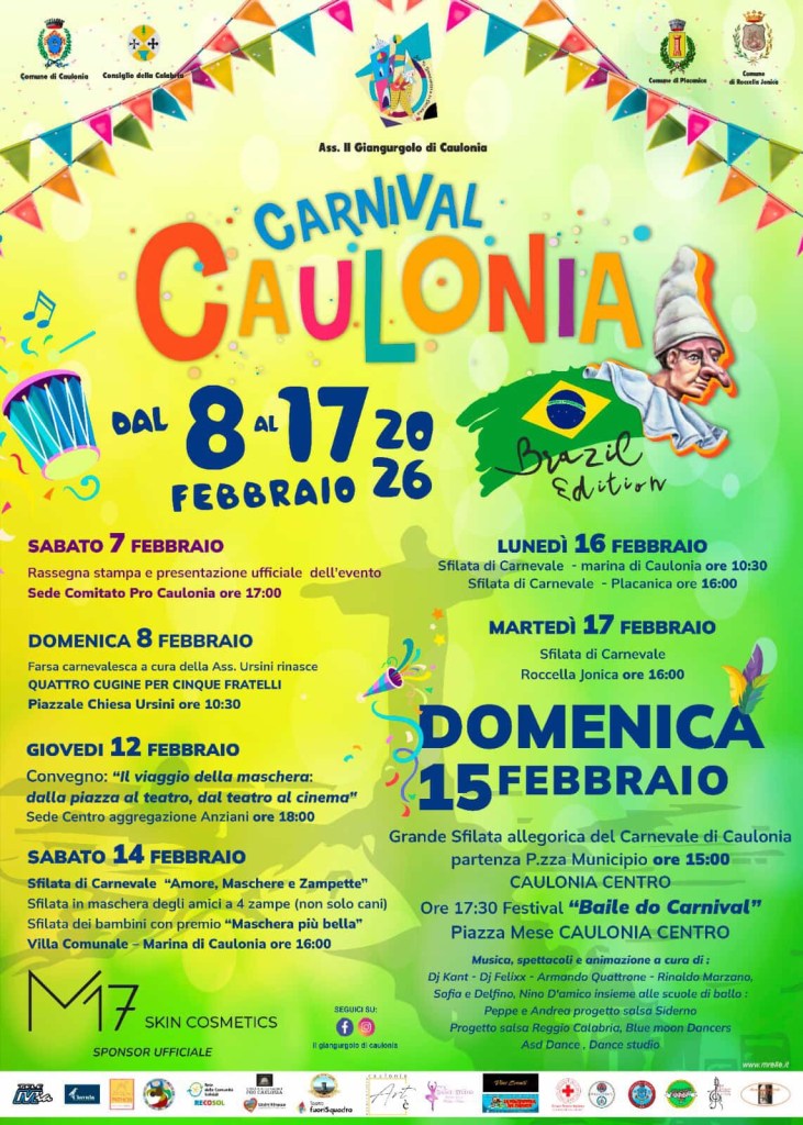 Il Carnevale di Caulonia 2026 è realizzato con il contributo delle istituzioni: Comune di Caulonia, Comune di Roccella Jonica, Comune di Placanica e Consiglio Regionale della Calabria. Lo sponsor ufficiale della manifestazione è M7 Skin Cosmetics.