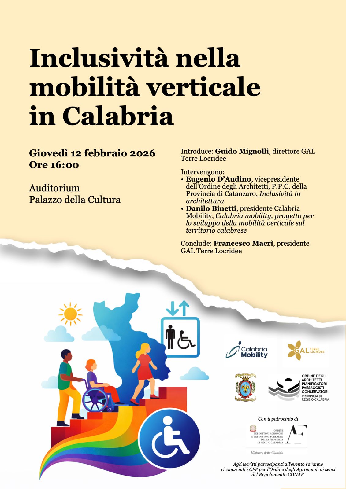 Si terrà giovedì 12 febbraio 2026, a partire dalle ore 16.00, nell’Auditorium del Palazzo della Cultura, a Locri, l’evento formativo dal titolo “Inclusività nella mobilità verticale in Calabria”, promosso da “Calabria Mobility” e dal Gal Terre Locridee, con il patrocinio della Città di Locri, dell’Ordine degli Architetti di Reggio Calabria e dell’Ordine degli Agronomi di Reggio Calabria.