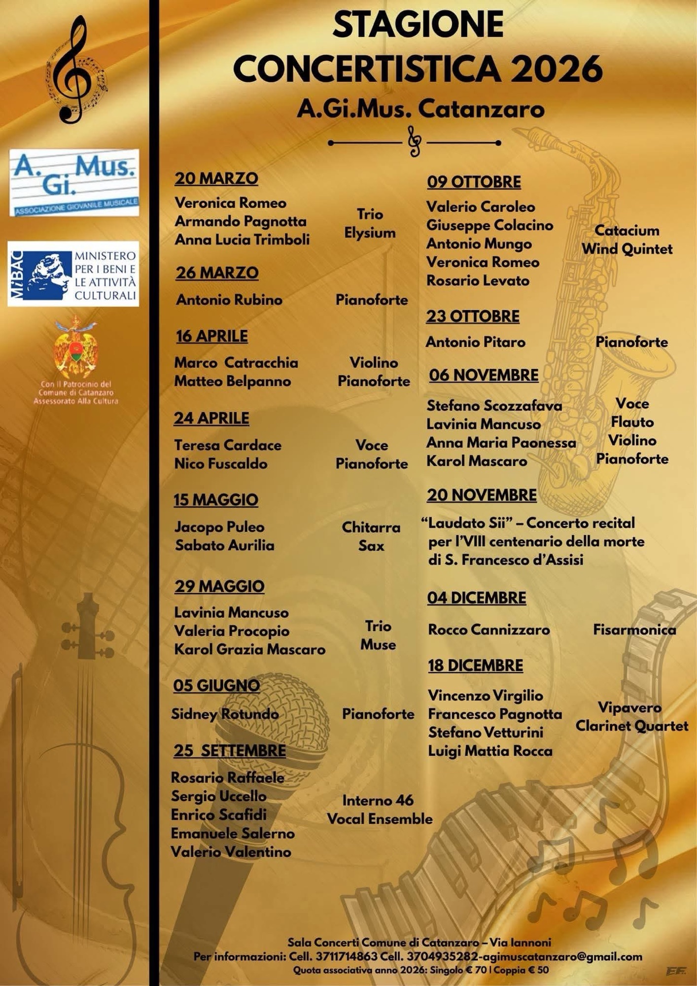Tra gli appuntamenti più significativi, come evidenziato dal direttore artistico, vi sarà nel mese di novembre un concerto interamente dedicato a San Francesco d’Assisi, in occasione dell’ottavo centenario della sua morte.