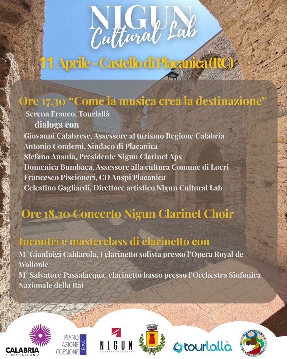 Placanica (RC), 11 aprile 2026 – Il borgo di Placanica torna protagonista della scena culturale calabrese con il secondo appuntamento del Nigun Cultural Lab, un progetto che intreccia musica, formazione e valorizzazione del territorio. L’iniziativa, ideata da Nigun Clarinet APS in collaborazione con il Comune di Placanica, Tourlallà e Anspi Placanica, è sostenuta dalla Regione Calabria nell’ambito dell’Avviso Pubblico “Sostegno e promozione turistica e culturale”. L’evento, a ingresso libero, si terrà nella suggestiva cornice del Castello di Placanica, simbolo della storia locale e luogo capace di trasformarsi, per l’occasione, in uno spazio di incontro e produzione culturale.