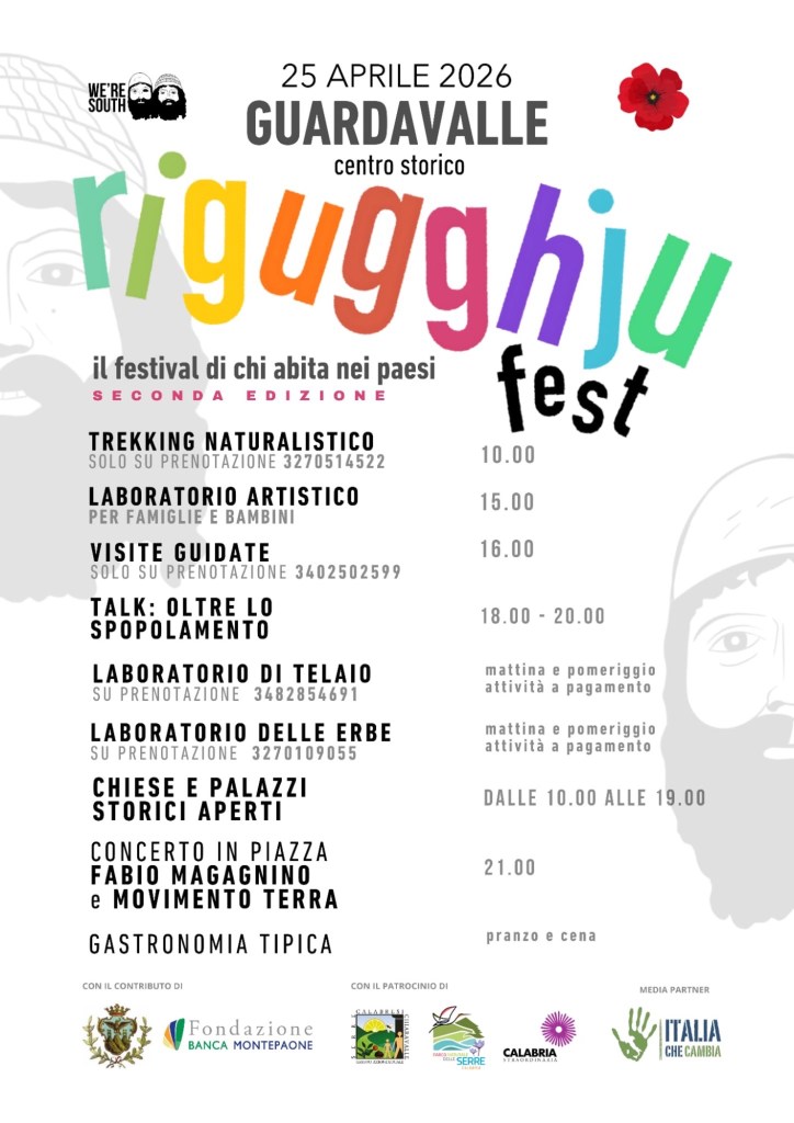 Il 25 aprile 2026 il centro storico di Guardavalle, nel Catanzarese, si trasformerà in un grande laboratorio a cielo aperto dedicato al futuro dei piccoli centri e delle aree interne. Dopo il successo dell’edizione inaugurale a Santa Caterina dello Ionio, torna infatti il “Rigugghju Fest – Il festival di chi abita nei paesi”, promosso dall’associazione WE’RE SOUTH.