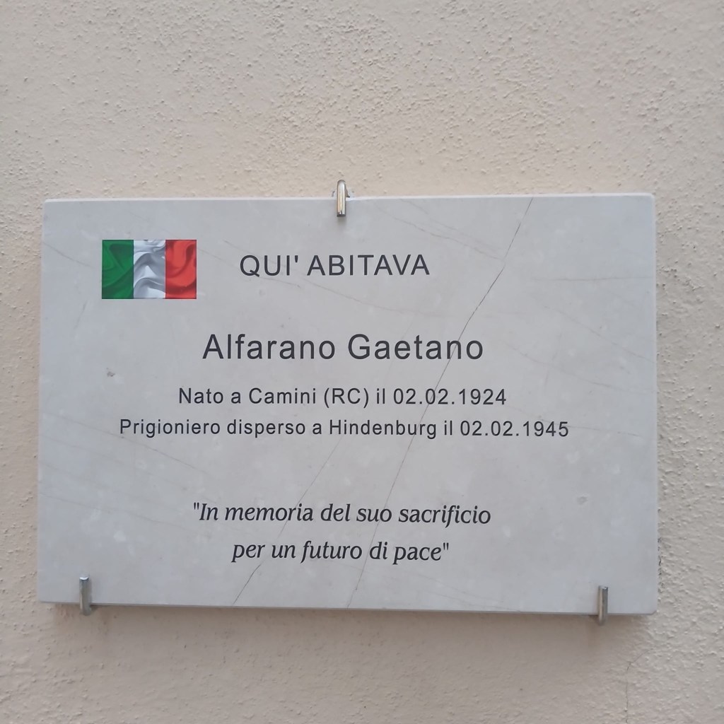 La targa di marmo posta sui muri della casa del fante Alfarano recita: qui abitava Alfarano Gaetano – nato a Camini il 2 febbraio 1924 – disperso a Hindenburg il 2 febbraio 1945 – In ricordo del suo sacrificio – Per un futuro di pace.
