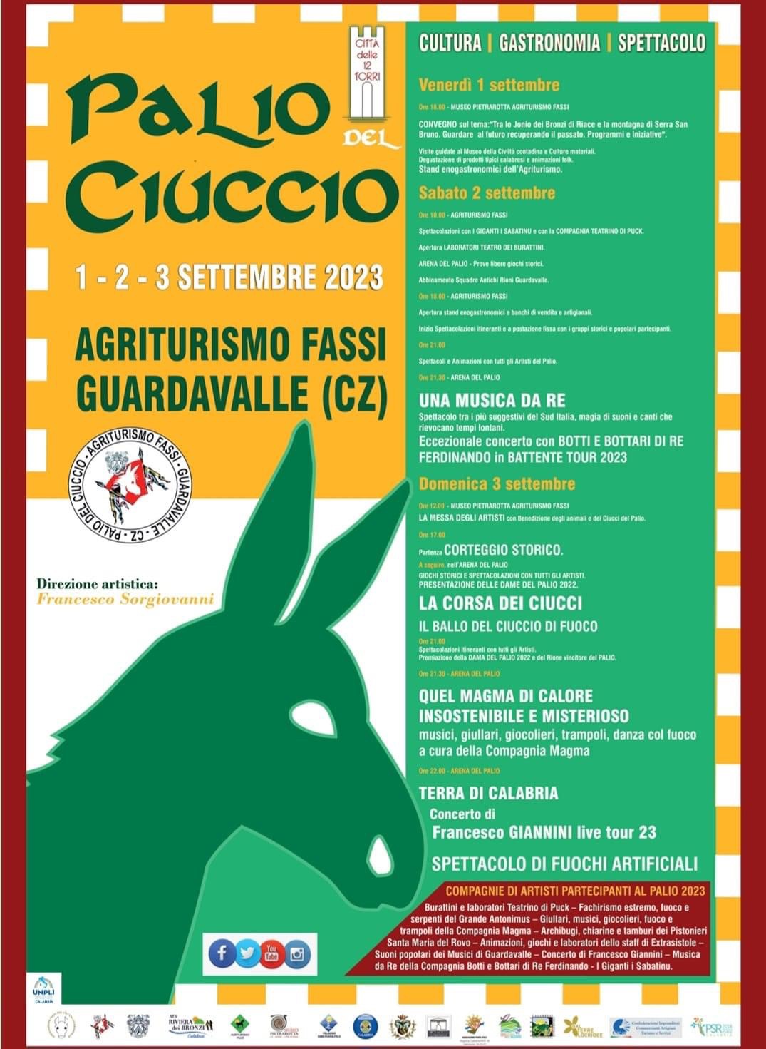Torna il Palio del Ciuccio di Guardavalle, manifestazione popolare a carattere storico, giunta alla sua XVII edizione. L’evento, voluto anni fa dai fratelli Guido, attivissimi operatori turistici della zona, si svolgerà dall’1al 3 settembre. L’iniziativa, promossa e patrocinata dalla Regione Calabria, Parco regionale delle Serre, Comune di Guardavalle, Gal Serre Calabresi e Terre LocrideeContinua a leggere “GUARDAVALLE: DALL’1 AL 3 SETTEMBRE 2023 LA XVII EDIZIONE DEL PALIO DEL CIUCCIO – CITTA’ DELLE 12 TORRI”