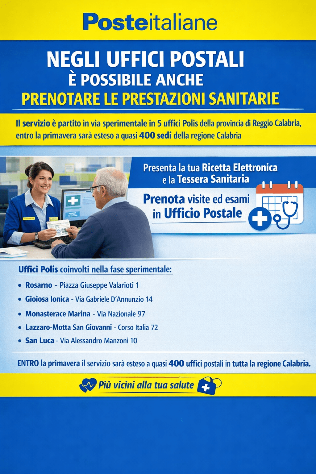 Il servizio è partito in via sperimentale in 5 uffici Polis della provincia di Reggio Calabria e, entro la primavera, sarà esteso a quasi 400 sedi della regione Calabria Roma, 27 febbraio 2026 – È stato avviato in via sperimentale il servizio di prenotazione delle prestazioni sanitarie in cinque uffici postali della provincia di ReggioContinua a leggere “POSTE ITALIANE: NEGLI UFFICI POSTALI È POSSIBILE ANCHE PRENOTARE LE PRESTAZIONI SANITARIE”