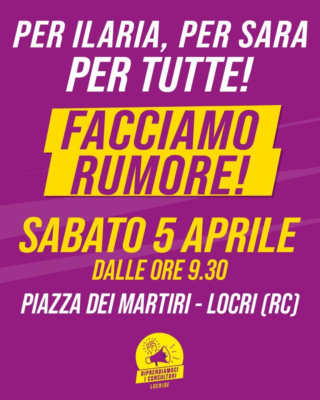 IN PIAZZA CONTRO IL FEMMINICIDIO E IL SISTEMA CHE LO PERMETTE Il movimento spontaneo Riprendiamoci i Consultori organizza una manifestazione pubblica sabato 5 aprile alle ore 9:30 in Piazza dei Martiri a Locri (RC). Scendiamo in piazza con rabbia e determinazione, a seguito degli ultimi femminicidi che hanno sconvolto il Paese, per dire con chiarezzaContinua a leggere “SABATO 5 APRILE, ORE 9:30 – PIAZZA DEI MARTIRI, LOCRI”