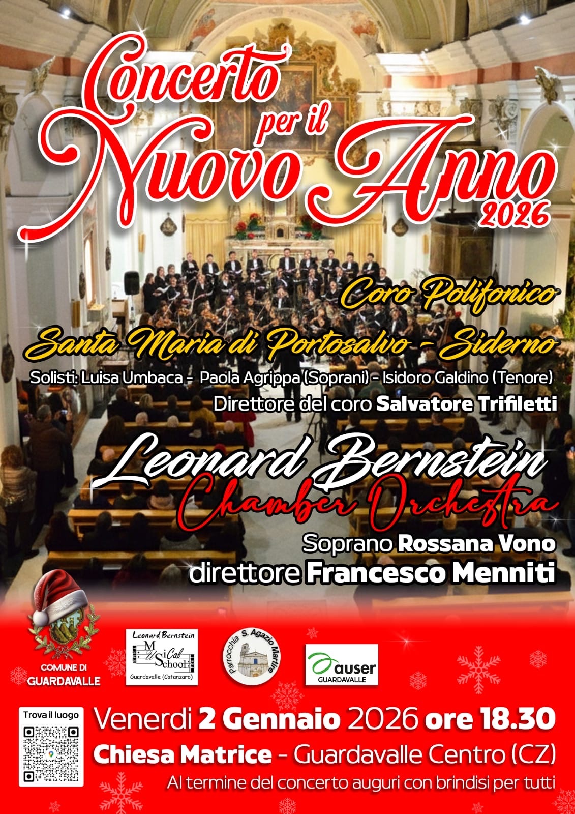 Un brindisi in musica alla speranza Torna anche quest’anno uno degli appuntamenti più attesi delle festività natalizie: il Concerto per il Nuovo Anno, in programma venerdì 2 gennaio 2026 alle ore 18:30 nella suggestiva Chiesa Matrice di Guardavalle centro. L’evento, organizzato e patrocinato dall’Amministrazione Comunale, in collaborazione con la Parrocchia di Sant’Agazio Martire e l’AssociazioneContinua a leggere “A Guardavalle il Concerto per il Nuovo Anno il 2 Gennaio 2026”