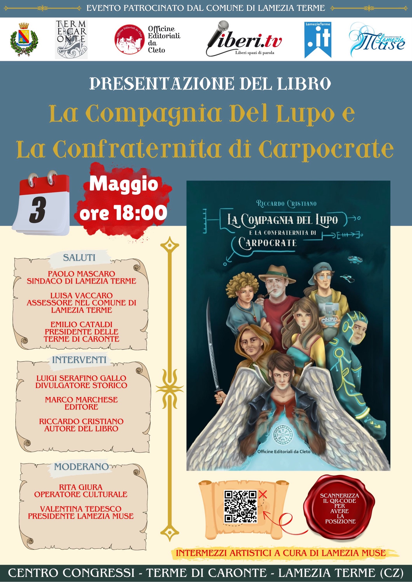 Venerdì 3 maggio 2024 alle ore 18:00 a Lamezia Terme (Cz) nella Sala Congressi delle Terme Di Caronte, Le Officine Editoriali da Cleto presenteranno il libro dal titolo LA COMPAGNIA DEL LUPO E LA CONFRATERNITA DI CARPOCRATE, dello scrittore di origini lametine Riccardo Cristiano. L’autore, dialogherà con Rita Giura, operatore culturale, Segretaria Open Space APS e Valentina Tedesco, Presidente dell’associazione Lamezia Muse, raccontando dettagli del libro ambientato in Calabria, nonché dei luoghiContinua a leggere “Lamezia: Presentazione libro La Compagnia del Lupo e la Confraternita di Carpocrate”