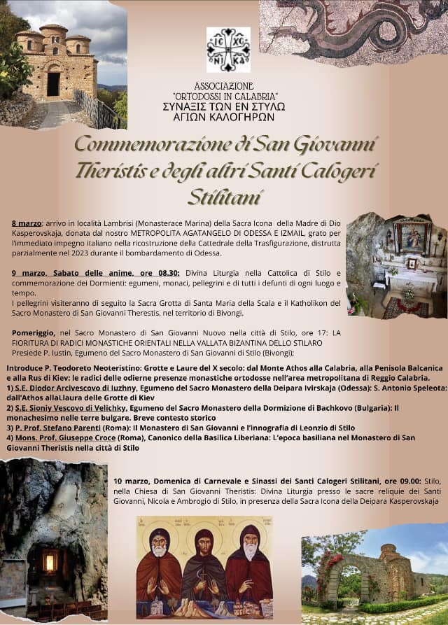 La Rinascita dell’Ortodossia in Calabria: Celebrando Trent’anni di Devozione Nel trentesimo anniversario dal ritorno in Calabria dei monaci dalla Santa Montagna dell’Athos, l’associazione “Ortodossi in Calabria” si è riunita per rendere grazie al Signore Gesù Cristo, Figlio di Dio, per il ritorno dei calabresi San Niceforo Il Mirovlita e San Niceforo Il Solitario nel XContinua a leggere “Stilo: Commemorazione di San Giovanni Therestis e dei Santi Calogeri Stilitani 8-10 Marzo 2024”