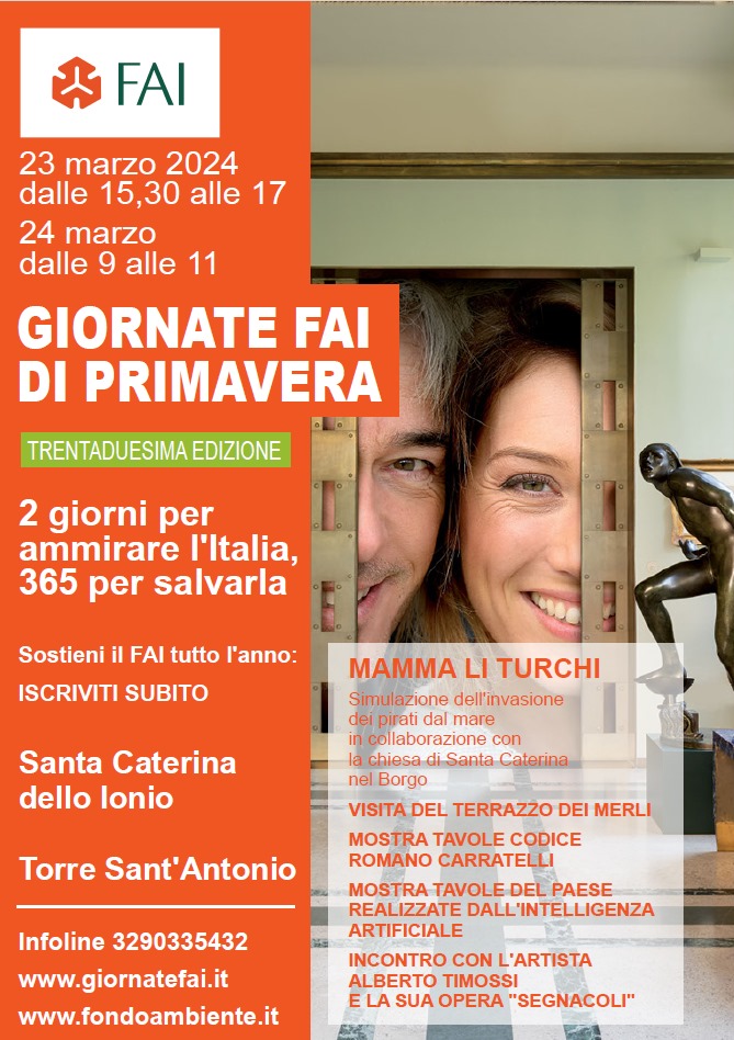 Sabato 23 e domenica 24 marzo 2024 si rinnova l’appuntamento con le Giornate FAI di Primavera, il più importante evento di piazza dedicato al patrimonio culturale e paesaggistico del nostro Paese. La manifestazione di punta del FAI, giunta alla 32ª edizione, offrirà l’opportunità di scoprire e riscoprire sorprendenti tesori d’arte e natura in tutta Italia, partecipando alle visite proposteContinua a leggere “Santa Caterina dello Ionio in primo piano nella presentazione delle giornate FAI di primavera”