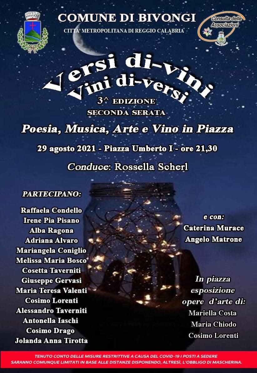 Domenica 22 Agosto 2021 si è svolta a Bivongi la 3°Edizione dell’evento Versi di Vini, Vini di Versi dedicata alla poesia in Vernacolo. Durante la serata si sono alternati momenti di poesia e musica accompagnati dal vino Bivongi DOC. Viste le numerose richieste di partecipazione da parte dei poeti, domenica 29 Agosto ci sarà laContinua a leggere “Versi di Vini, Vini di Versi 3°Edizione”